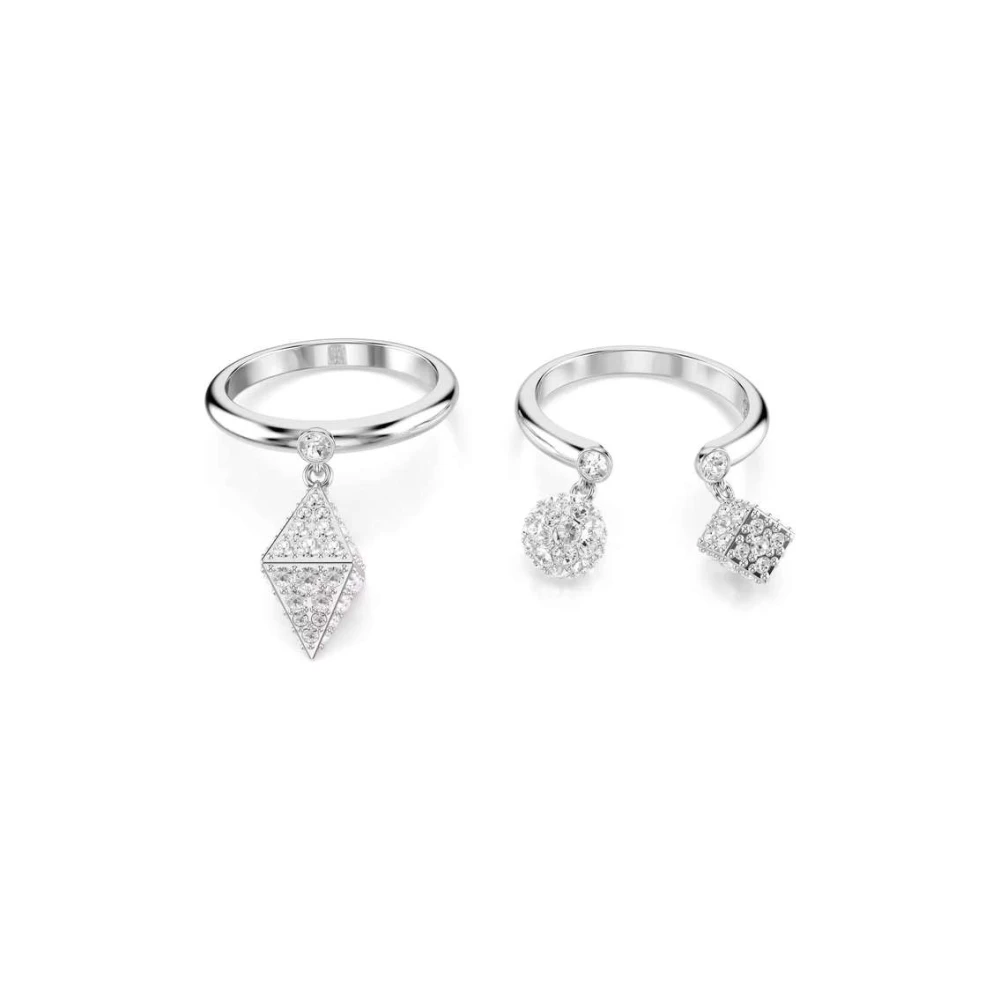 Esse multifacetado conjunto de anéis revela formas criativas que deslumbram com seus design únicos, o aro aberto apresenta uma esfera e um cubo, revestidas em ródio e adornados com pavé em lapidações diversas.