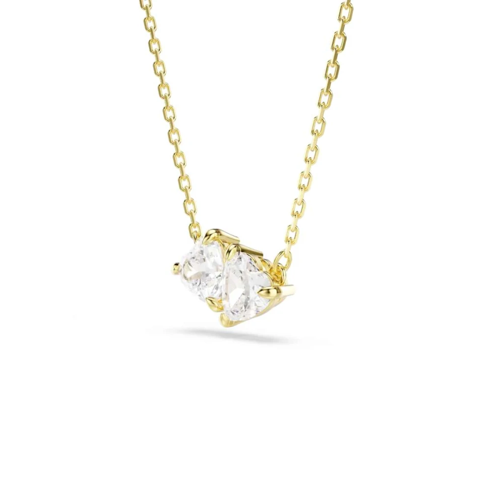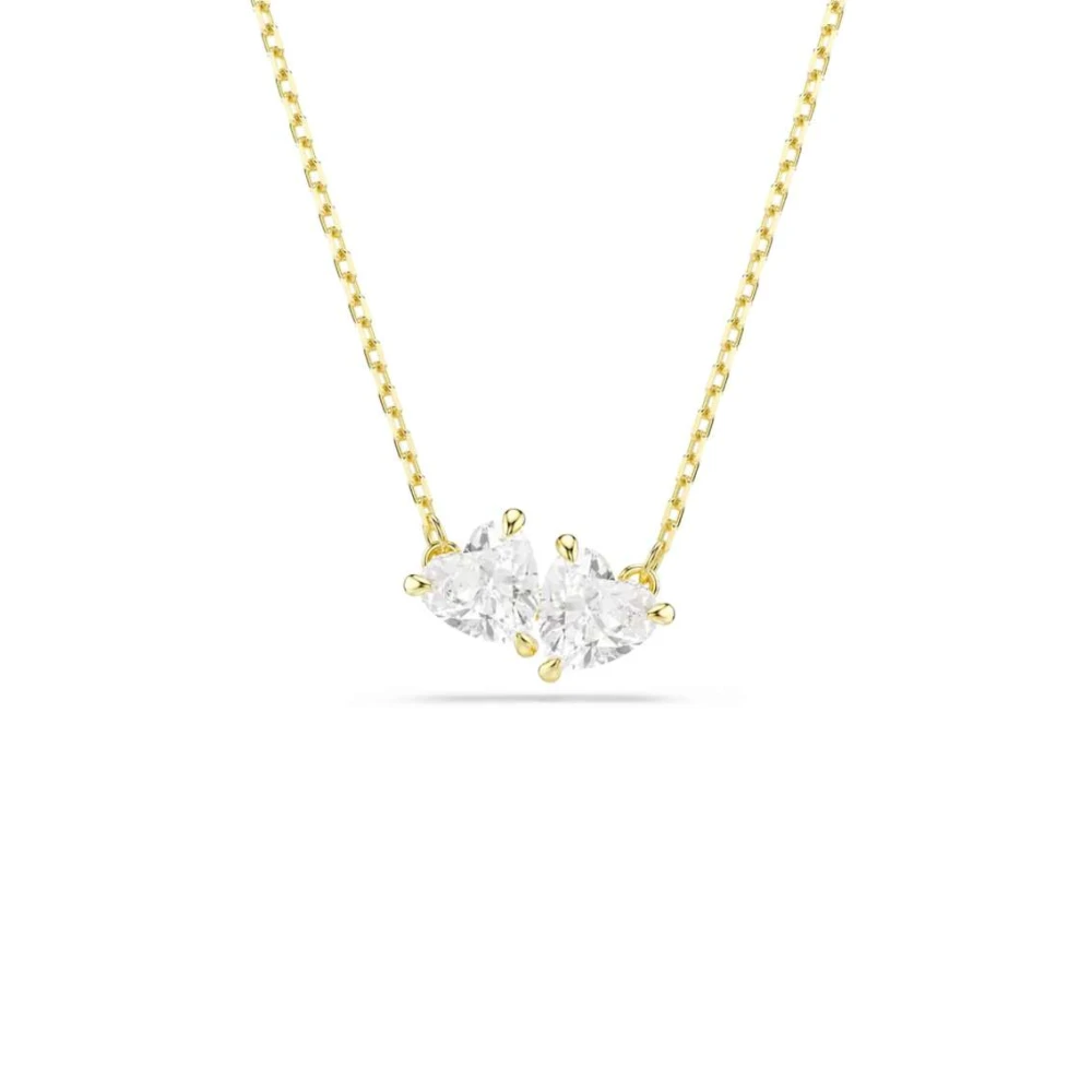 O colar Mesmera é banhado a ouro com duas zircônias de coração como pingente central, com uma delicada corrente com fecho de camarão.