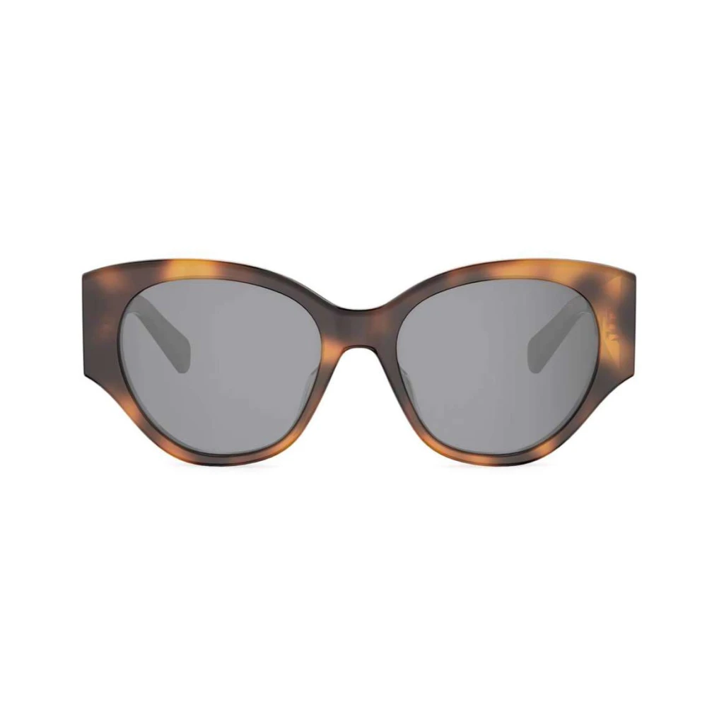 Os óculos de sol Celine Triomphe exibem modelo oversized em acetato tortoise, complementados com lentes cinzas e adornados com a logo Triomphe em dourado nas hastes.