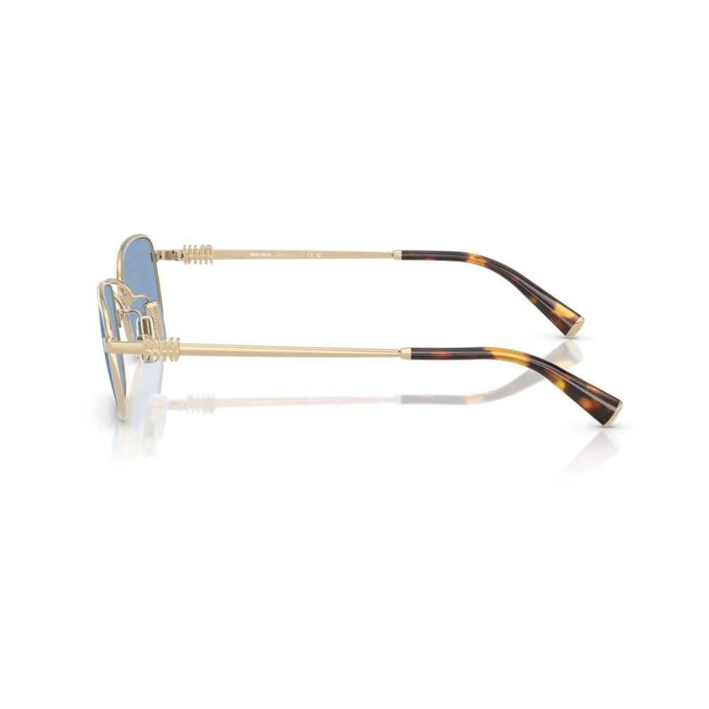 Uma representação de design lúdico e vanguardista, os óculos de sol Miu Miu MU A53, apresentam armação retangular em acabamento dourado pálido, lentes em tom azul suave e ponteiras em acetato tortoise.