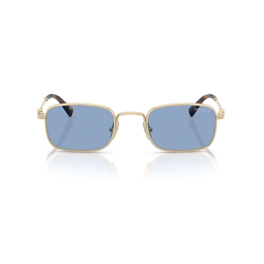 Uma representação de design lúdico e vanguardista, os óculos de sol Miu Miu MU A53, apresentam armação retangular em acabamento dourado pálido, lentes em tom azul suave e ponteiras em acetato tortoise.