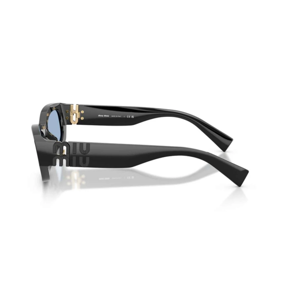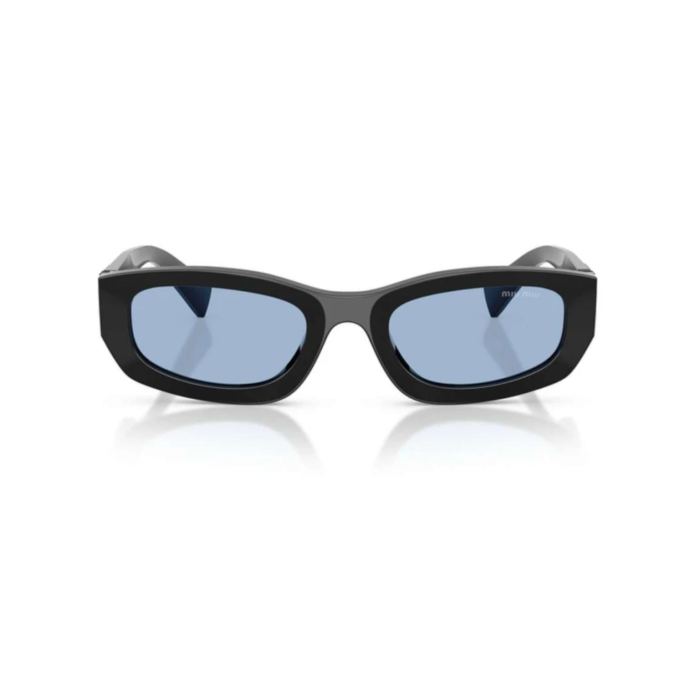 Os óculos de sol Miu Miu MUB04S apresentam formato retangular ousado em acetato preto, combinado com lentes azuis e adornados com a logo nas hastes.