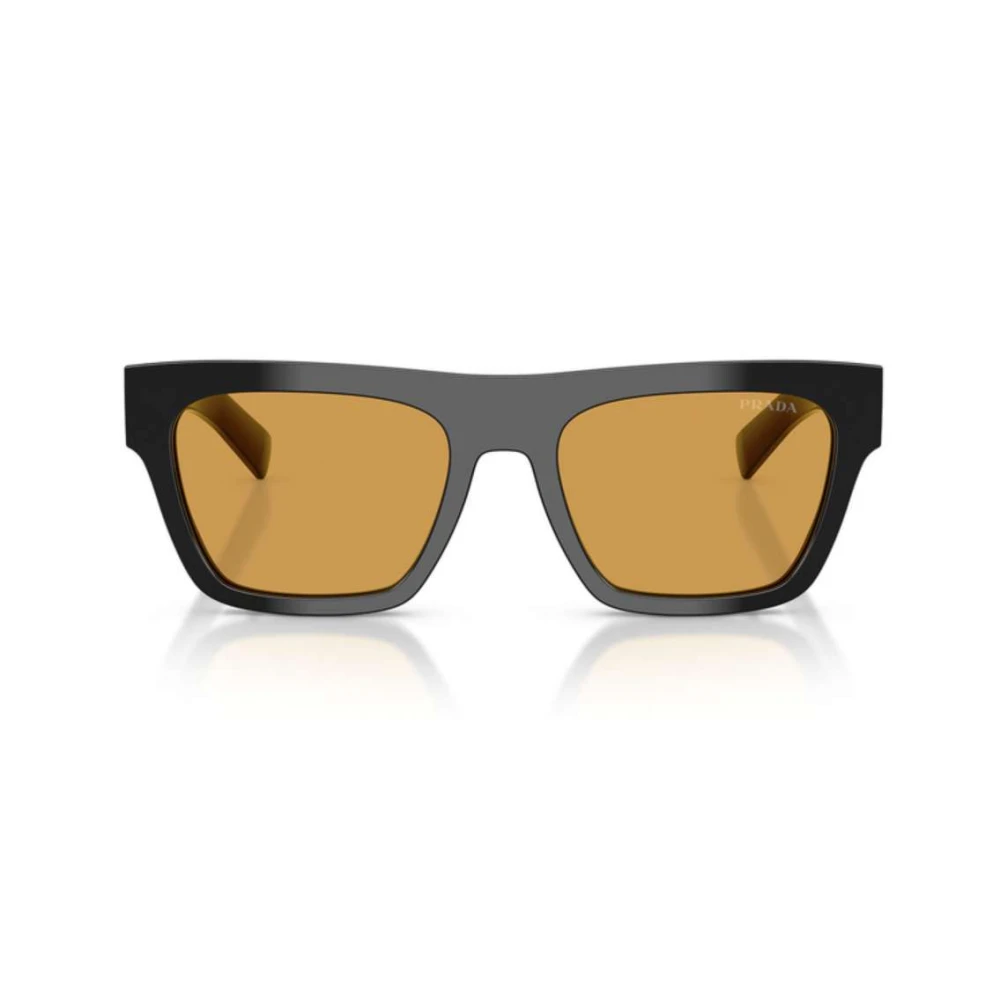 Os óculos de Sol Prada PR C03 apresentam formato clássico quadrado em acetato preto, com um visual marcante, o modelo combina estilo contemporâneo com estética sofisticada, o design é combinado com lentes âmbar e as hastes são adornadas com a logo em prata.