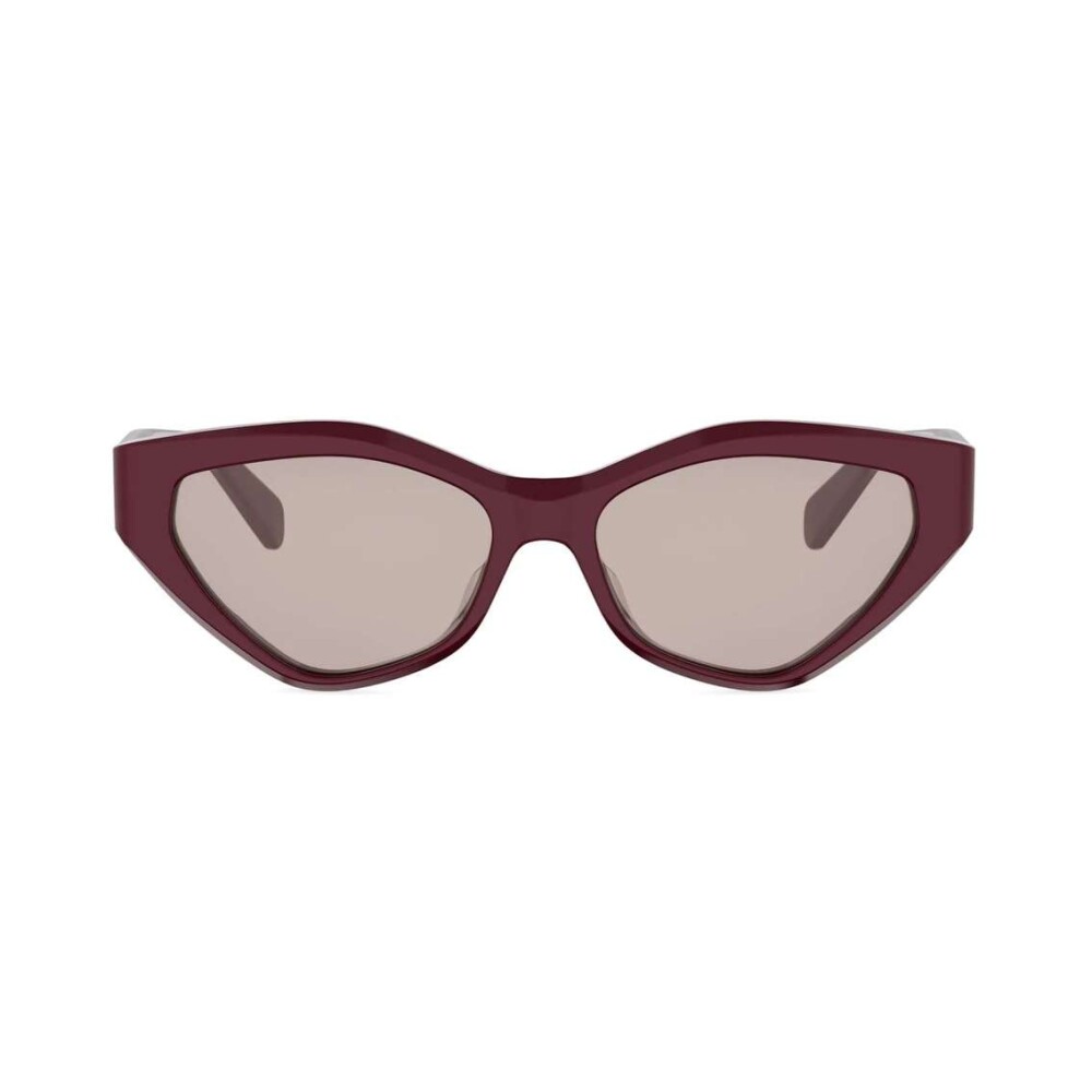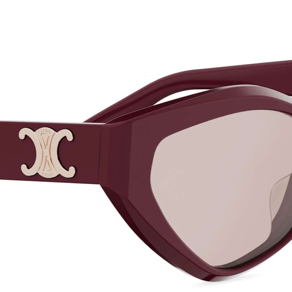 Os óculos de sol Celine CL40323U apresentam formato geométrico em acetato marsala, complementados com lentes claras em cinza, o modelo é adornado pela icônica logo Triomphe em dourado nas hastes.