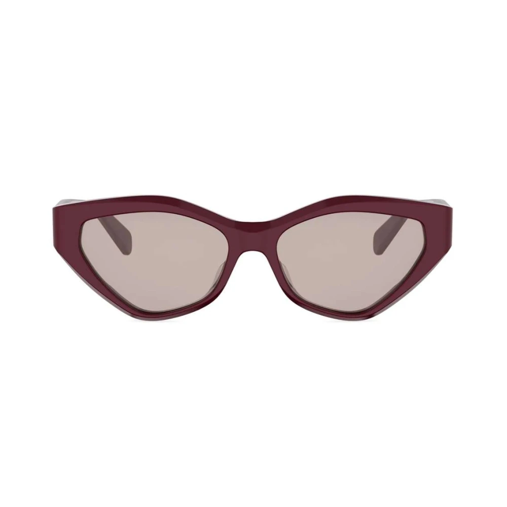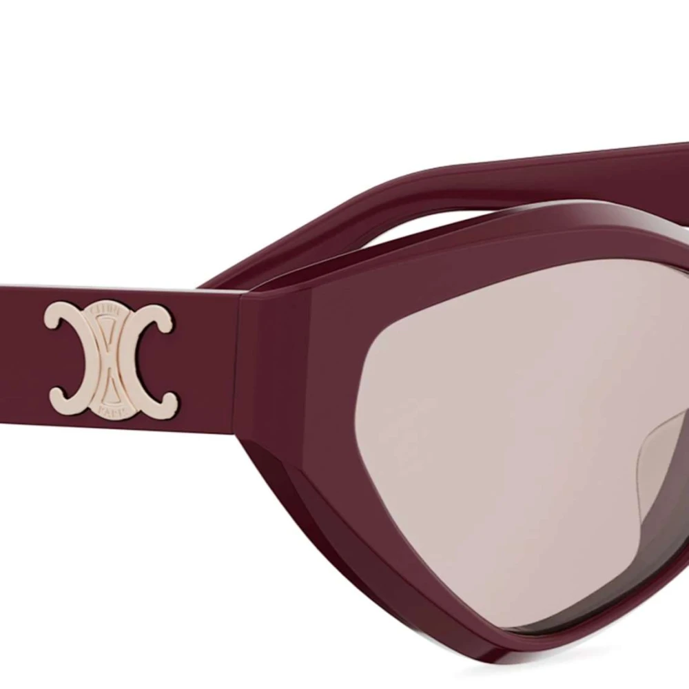 Os óculos de sol Celine CL40323U apresentam formato geométrico em acetato marsala, complementados com lentes claras em cinza, o modelo é adornado pela icônica logo Triomphe em dourado nas hastes.