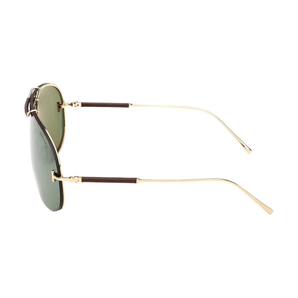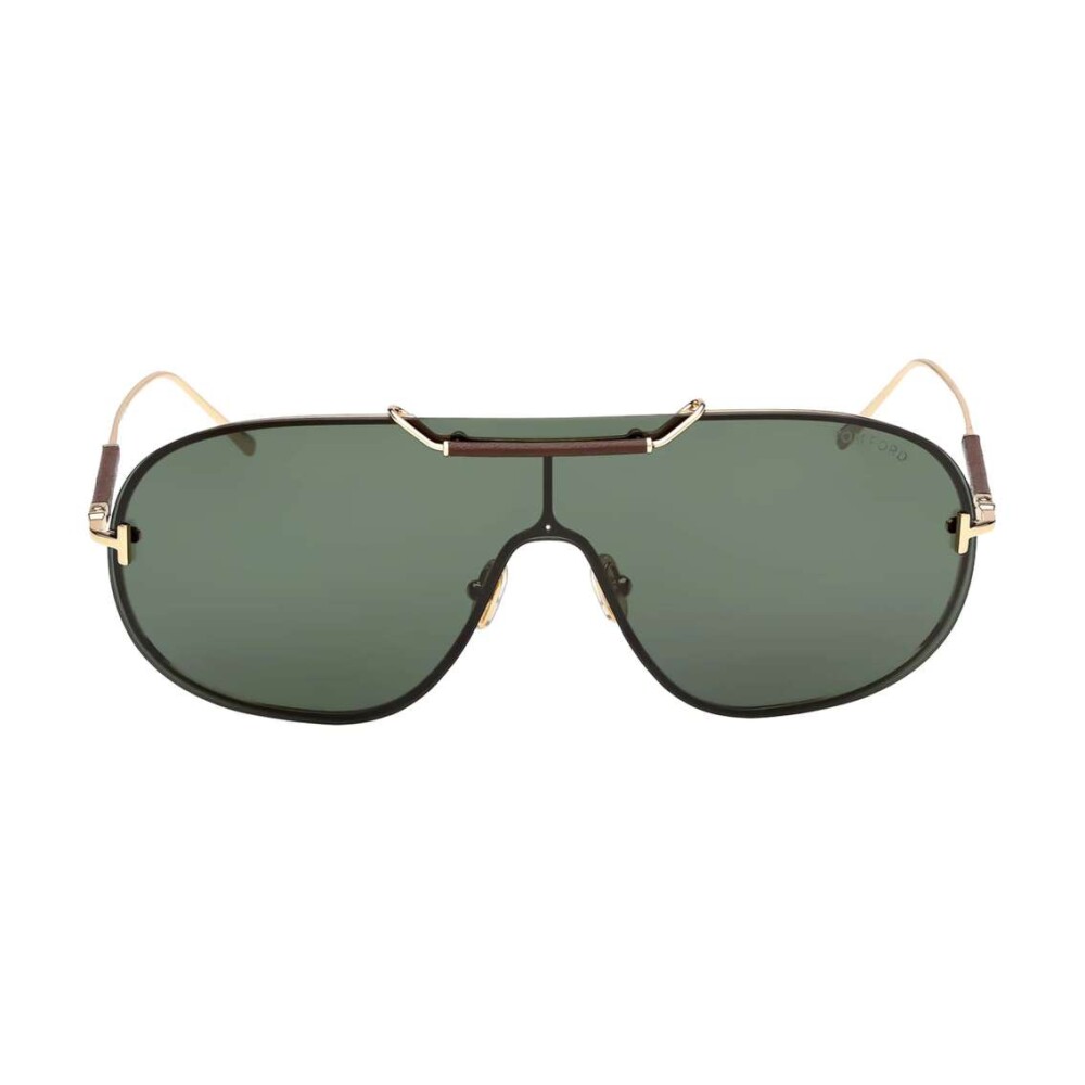 Os óculos de sol Tom Ford Tyler 02 exibem formato máscara e aros em metal dourado, suas lentes são verdes e a tradicional logo Tom Ford adorna o modelo.