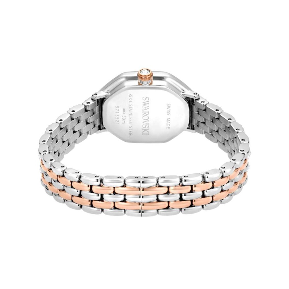 O relógio Dextera possui acabamento bicolor, caixa octogonal de 18x23mm, aro pavé com 46 cristais e um cristal na coroa, o mostrador conta com índices de cristal, bracelete de cincos elos com 108 cristais, Swiss Made e resistente à água até 50m.